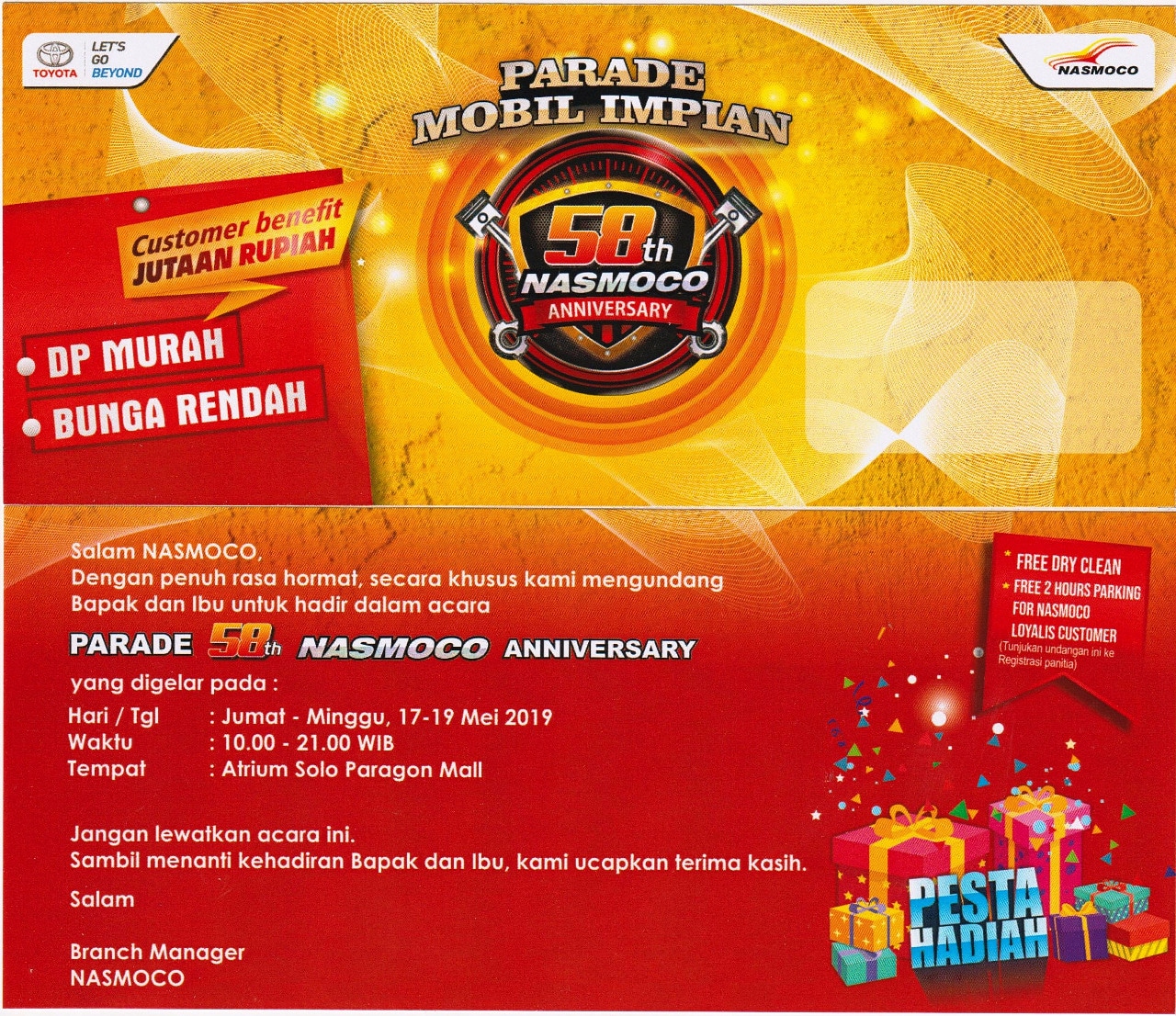 Waktu yang tepat membeli mobil baru Toyota, karena di bulan ini bertepatan dengan perayaan ulang tahun Nasmoco yang ke 58 serta menjelang Lebaran 2019. Sehingga banyak kejutan promo menarik setiap pembelian mobil baru Toyota tipe apapun.